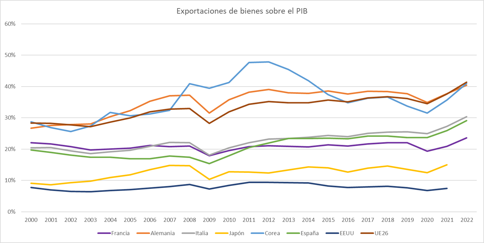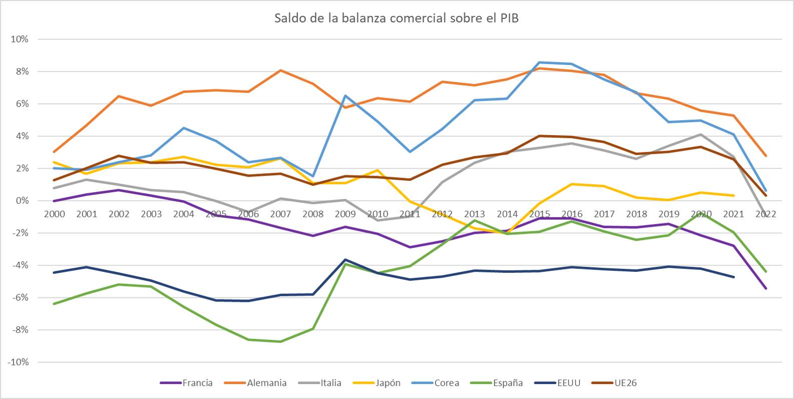 España redujo significativamente el déficit comercial entre 2007 y 2020, pero en 2021 y 2022 volvió a aumentar hasta niveles de 2009, debido fundamentalmente a la importación neta de productos energéticos.