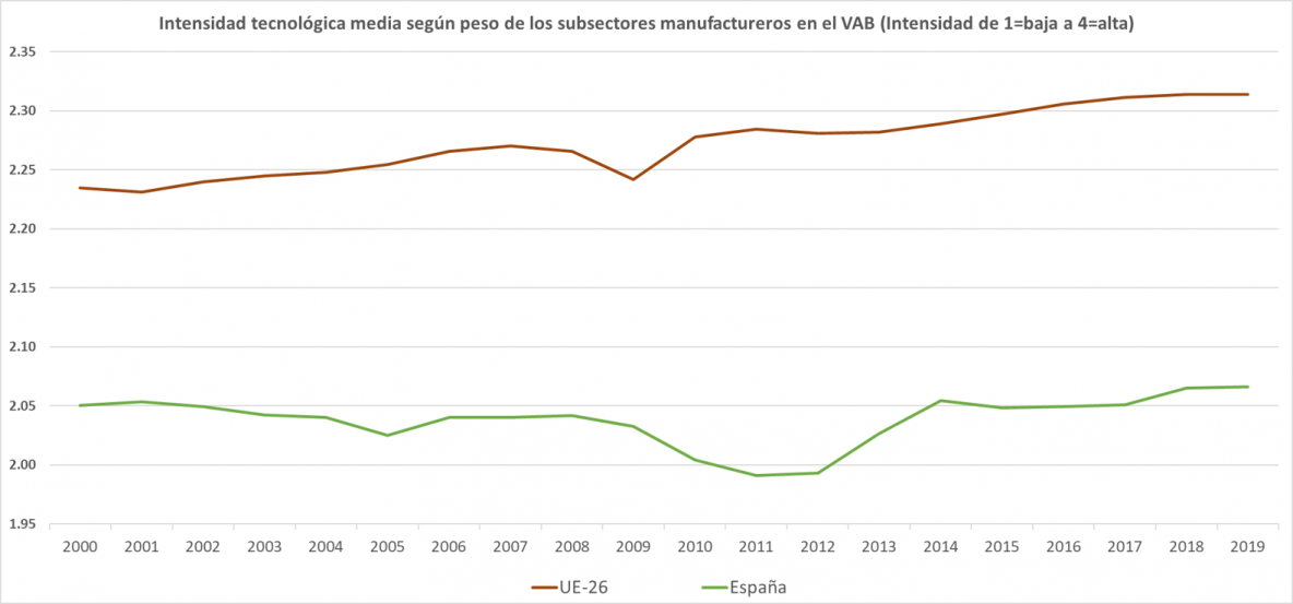 Entre 2000 y 2019, la intensidad tecnológica media del sector manufacturero español, que ya era menor que la de la UE-26 en el año 2000, ha seguido perdiendo terreno.
