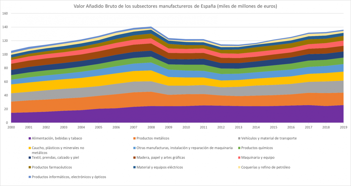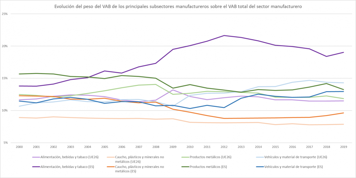 Se observa que los subsectores de alimentación, bebidas y tabaco, productos metálicos, vehículos y material de transporte, y caucho y plásticos suponen más de la mitad del VAB total del sector manufacturero (55% en 2019).