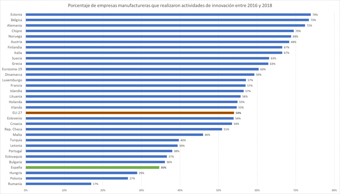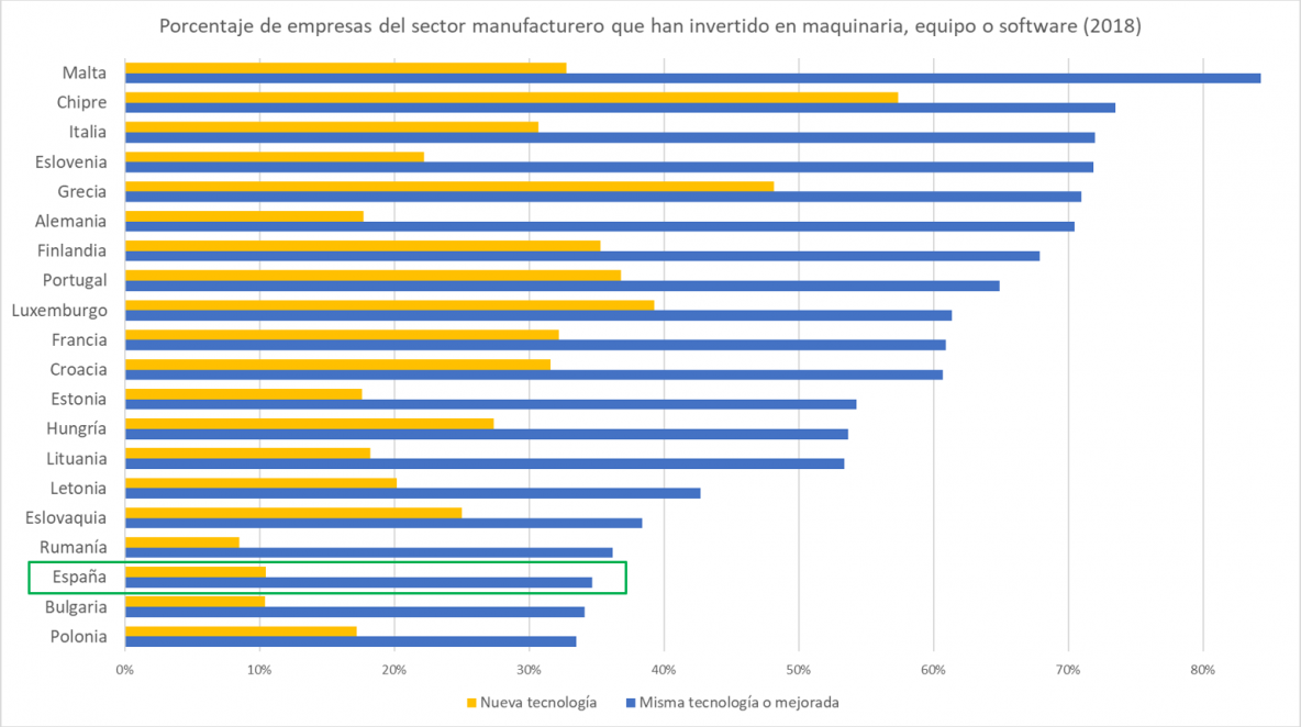 España es uno de los países de la UE donde un menor porcentaje de empresas del sector manufacturero invirtieron en maquinaria, equipo o software (nuevo o mejorado), en el año 2018.