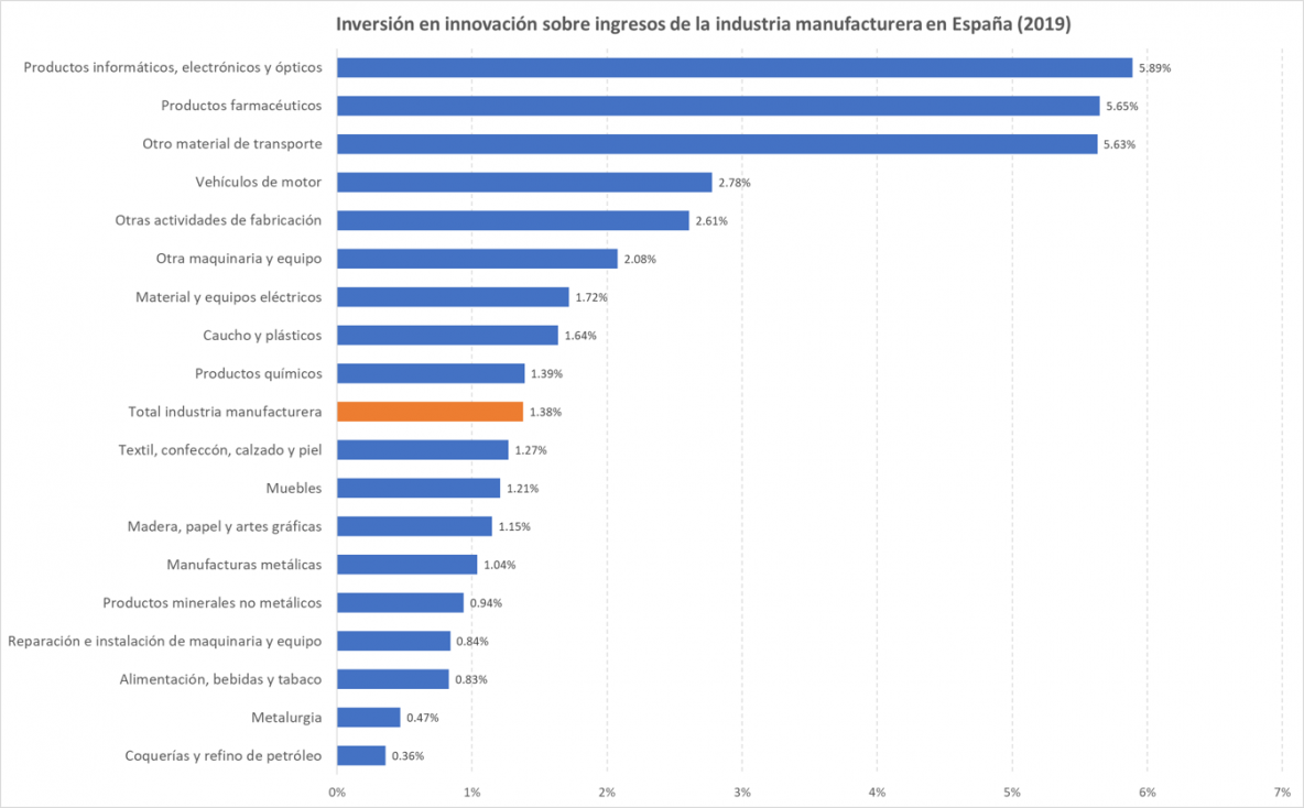 El porcentaje medio de inversión en innovación sobre la cifra de ingresos de las empresas manufactureras, es baja. Los sectores manufactureros con mayor intensidad en innovación son los de productos informáticos, electrónicos y ópticos, productos farmacéuticos y otro material de transporte.