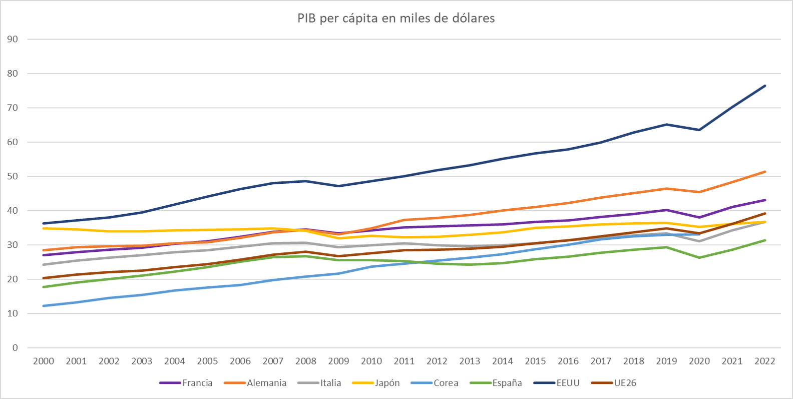 Desde 2007 la renta media de los españoles viene cayendo con respecto a la mayoría de los países, en especial con respecto a la UE.